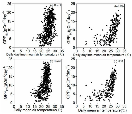 We evaluated the effects of air temperature on the GPPEC by the relationships between the GPPEC and the daily daytime mean air temperature and daily mean air temperature at the two sites (Figure 5). At the Brazil site, the GPPEC increased as the daily daytime mean air temperature or daily mean air temperature increased and reached its plateau at ~25 °C (Figure 5a,c). At the USA site, the GPPEC increased as the daily daytime mean air temperature or daily mean air temperature increased and reached its plateau at 28 °C (Figure 5b,d).