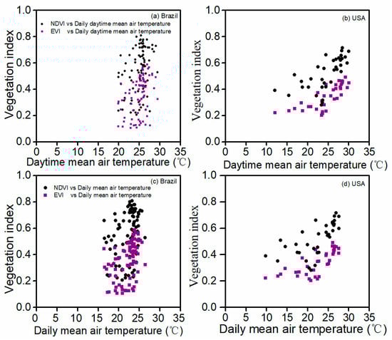 We further investigated the effect of air temperature (daily daytime mean air temperature, daily mean air temperature) on the vegetation indices (NDVI and EVI) (Figure 6). The NDVI and EVI rose with the daily daytime mean air temperature and reached their plateau at 25 °C at the Brazil location and 25 °C for the USA location (Figure 6a,b). The NDVI and EVI were positively correlated with the daily mean air temperature and reached their plateau at 25 °C at the Brazil site and 28°C at the USA site (Figure 6c,d).
