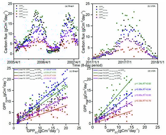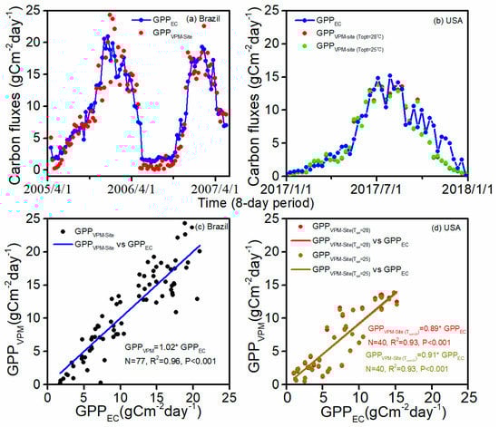 There are strong linear relationships between the GPPEC and GPPVPM-Site in the sugarcane growing seasons at the two sites (Figure 7c,d). The linear regression models between the GPPEC and GPPVPM-Site indicate discrepancy at the Brazil site (2%) and the USA site (25°C, −9%; 28°C, −11%). The seasonal sum of GPPVPM-Site during the growing season defined by the GPPEC at the Brazil site during 2005/2006 and 2006/2007 was 3968 and 2868 g C m−2 yr−1, approximately 1.67% lower than the sum of the GPPEC in 2005/2006 (4035 g C m−2 yr−1) and 0.95% higher than the sum of the GPPEC in 2006/2007 (2841 g C m−2 yr−1) (Table 1). The seasonal sum of the GPPVPM-Site during the growing season defined by LSWI at the Brazil site during 2005/2006 and 2006/2007 was 3913 and 2776 g C m−2 yr−1, approximately 1.01% higher than the sum of the GPPEC in 2005/2006 (3873 g C m−2 yr−1) and 4.53% higher than the sum of GPPEC in 2006/2007 (2656 g C m−2 yr−1). The seasonal sum of the GPPVPM-Site during the growing season defined by the GPPEC at the USA site in 2017 was between 1979 g C m−2 yr−1 (25 °C) and 1976 g C m−2 yr−1 (28 °C), or 10.06~10.17% lower than the sum of the GPPEC (2200 g C m−2 yr−1). The seasonal sum of the GPPVPM-Site during the growing season defined by LSWI at the USA site in 2017 was between 1699 g C m−2 yr−1 (25 °C) and 1709 g C m−2 yr−1(28 °C), or 9.68~10.25% lower than the sum of the GPPEC (1893 g C m−2 yr−1) (Table 1).
