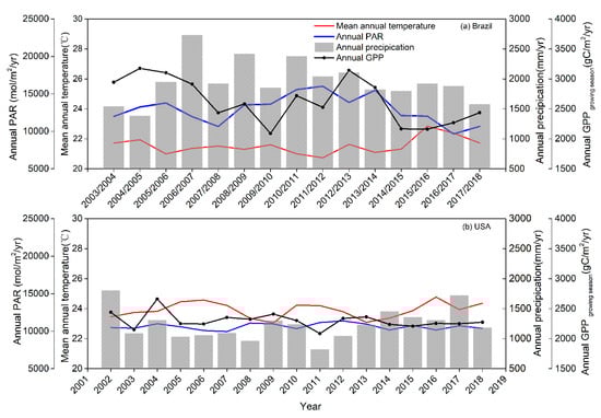 Table S2 shows the total GPP estimated by the VPM model and NCEP climate data (GPPVPM-NCEP) during the sugarcane growing season from 2000–2018 at the two sites. The total GPPVPM-NCEP at the Brazil site varied from 2090 g C m−2 yr−1 in 2009/2010 to 3176 g C m−2 yr−1 in 2005/2006, which is closely related to climate variation, especially annual PAR (Figure 9a). The total GPPVPM-NCEP at the USA site ranged from 2607 g C m−2 yr−1 in 2011 to 3327 g C m−2 yr−1 in 2004.