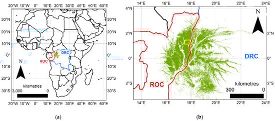 The location of the Centrale Cuvette peat deposit (green) in the Republic of Congo (ROC) and Democratic Republic of Congo (DRC) []; (a) large scale; (b) local scale, field site in yellow.