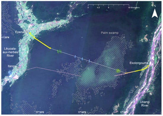 Figure 2 shows the forest area studied in this work. This region is covered by hardwood trees or palm-dominated areas of swamp further from the peatland edge [] between the Likouala-aux-Herbes and Ubangi rivers, and has water above or close to the surface year-round [], containing underlying peat as detailed below. The field site is in Likouala Department, Republic of Congo. Field and remotely-sensed data were combined to build up a picture of peatland topography along a path between Epena and Ekolongouma, as shown in Figure 2.