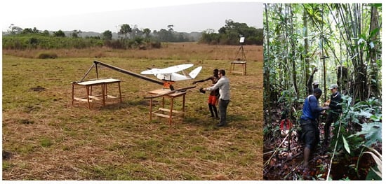 The unmanned aerial vehicle (UAV) prepared for launch at the cleared site near Ekolongouma, and peat depth field measurements being made in the hardwood forest.