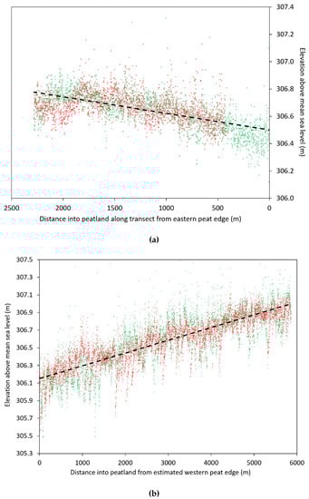 Estimated ground elevation points per meter along UAV transect from the estimated peat edge. Green points are derived from the outgoing flight and red from the returning flight. (a). Ekolongouma. The total transect is 2269 m long, for 1862 m of which we have both outgoing and returning flight data. The fitted line slope is 0.121 m·km–1. (b). Epena. Total transect length is 5861 m. The fitted line slope is 0.145 m·km–1.