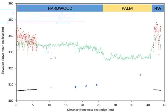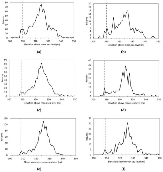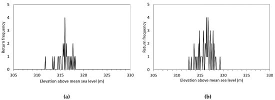 In the east track, the 61 GLAH14 (terrain) returns (Figure 6a) showed a unimodal distribution, around 317 m above mean sea level, and the 31 GLAH06 returns showed a unimodal distribution (Figure 6b) centred at 316 m. Since the terrain–canopy separation should be 10 m or more, both of these seemed to be representing either canopy or terrain. The nearest UAV measurements showed the terrain about 10 m below this, and TanDEM-X showed an elevation of 316–318 m in this region. The classification, as shown in Figure 2, indicated that this area is palm-dominated, whereas the other satellite and UAV altimetry used here was acquired over hardwood tree regions, suggesting that the larger leaves of the palm swamp forming a more even and lower canopy prevented ground returns.