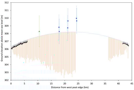 Figure 9 shows all of the acquired data believed to describe the ground elevation along the west–east path from Epena to Ekolongouma shown in Figure 2. Because of the estimated downward bias of the UAV LiDAR ground elevation estimates, a 20 cm upward error bar was marked. Error bars for ICESat were marked as 2.0 m [], and for ICESat-2 as 1.6 m []. While the sparsity of data around the centre of the peatland precluded identifying the precise shape, a parabola was fitted to the data with a peak of 308.2 m above mean sea level, 306.1 m at the western edge of the peat and 306.7 m at its eastern edge, suggesting a peat dome with a highest point approximately 1.8 m above its edges. While this line falls 1–2 m below the satellite-based measurements, we are much more confident in the UAV-based measurements and, given the slopes at either edge, a slope increase to reach the ICESat-2 central elevations indicated seems implausible, and we have to conclude that the ICESat and ICESat-2 measurements exhibit a systematic upward bias.