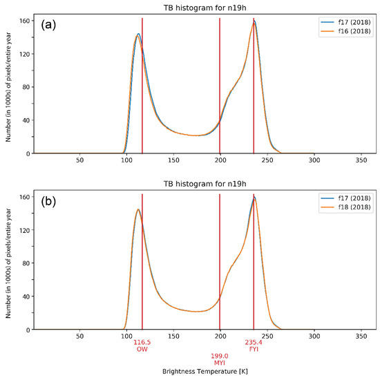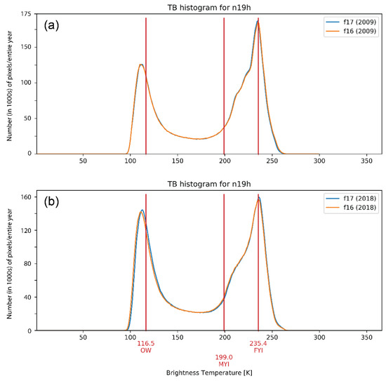 Annual histogram of Arctic (Northern Hemisphere) 19H TBs for F17 and F16 SSMIS in (a) 2009, and (b) 2018 (same as in Figure 2a). The F17 tie point values for open water (OW), FYI, and MYI are overlaid in red.