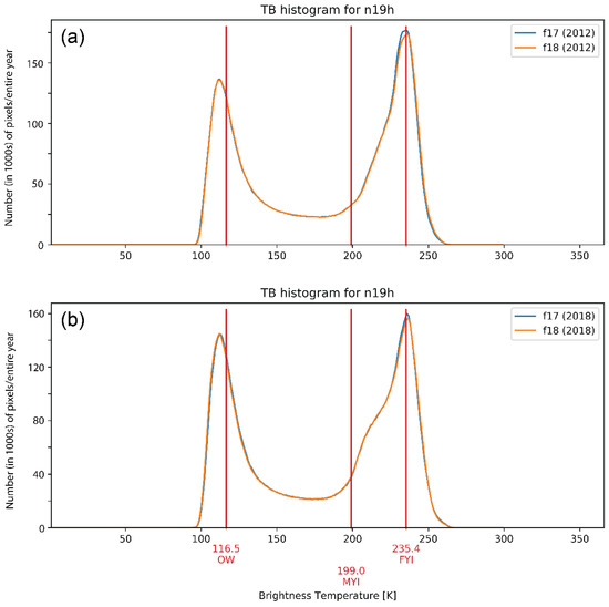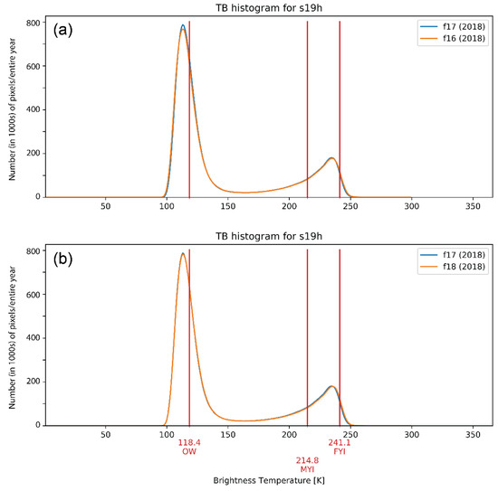 First, examining 2018, the TB histograms of the sensors qualitatively match very well (Figure 2 and Figure 3 for 19H; see Supplement, Figures S1–S8, for other channels). The two peaks of the distributions, corresponding to open water (low TB) and 100% ice (high TB corresponding to primarily FYI) almost completely overlap. The peaks either fall into the same 1 K bin or differ by only one bin. Qualitatively, the distributions between the sensors appear to have better agreement than was documented for F13 (SSMI) and F17 (SSMIS) [21].