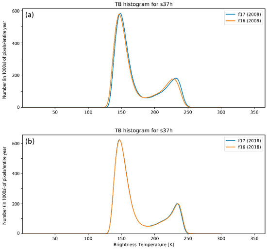 Annual histogram of Antarctic (Southern Hemisphere) 37H TBs for F17 and F16 SSMIS in (a) 2009, and (b) 2018. Note that 37H is not used in the NT algorithm.