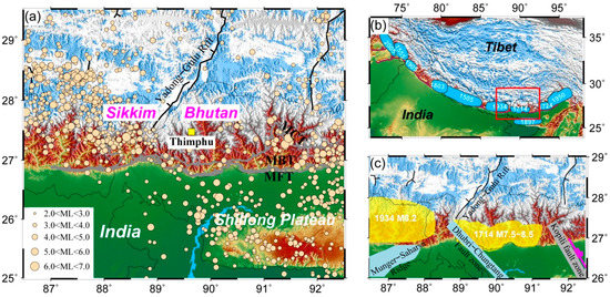 The collision and ongoing convergence of India with Eurasia, initiated ~50 Ma ago, have formed the giant Himalayan subduction zone and given rise to the highest mountains on Earth [1,2]. The Himalayan arc, with total length of ~2500 km, has experienced more than eight large megathrust earthquakes during the past centuries and shown a few seismic gaps with elapsed time of the latest large earthquake over 300 years (Figure 1b) [3,4]. The Sikkim–Bhutan segment, showing the most prominent seismic gaps in the Himalayan earthquake belt, has attracted extensive attentions to the state of stress accumulation and its future seismic risk [5,6,7]. Over the past half millennium, the only reported large event in the Sikkim–Bhutan Himalaya is the M 7.5~8.5 earthquake in 1714 that perhaps ruptured the megathrust along most of the Bhutan Himalayas [8]. The seismogenic potential for this densely populated region remains enigmatic due to its weak seismic activity compared to the rest of the Himalayan orogenic belt (Figure 1a) [9].