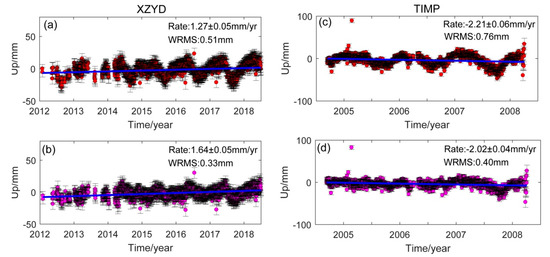 In Figure 3, we compare observed GPS time series with the HYDL-predicted displacements for two typical sites (XZYD, DEOT). We can see strong correspondence between the GPS-observed and HYDL-predicted seasonal variations in both the amplitudes and phases for the vertical components, while the correspondence between the GPS-observed and HYDL-derived seasonal variations for the East and North components is less well. We think this difference could be influenced by a small horizontal signal and the spatial smoothing of the HYDL model. Therefore, we only use HYDL predictions to correct the hydrological influences from the vertical components of the detrended GPS time series of each continuous site. We do not correct the hydrological effects of campaign sites due to their limited observation time periods. Generally, the misfit between data and linear fit decrease significantly after the correction. We choose the continuous GPS stations XZYD and TIMP for examples. Figure 4 shows the comparison of the vertical GPS time series before and after correcting hydrological loading effects. The Weighted Root Mean Square (WRMS) is after the correction decreased by 35% (from 0.51 mm to 0.33 mm) and 47% (from 0.76 mm to 0.40 mm) for sites XZYD and TIMP, respectively. We note that some residual seasonal variations still can be recognized in the corrected time series after removing seasonal effects using the HYDL mode (Figure 4b). This indicates that the seasonal variations in the GPS-observed time series are not only caused by hydrological mass loading effects. Many other factors, such as the atmosphere mass loading, could also contribute to generating the seasonal variations in the GPS time series. After correcting the hydrologic loading effects, we re-estimate the vertical velocities for the 15 continuous sites. The estimated velocities with respect to the International Terrestrial Reference Frame 2008 (ITRF08) inference frame are then transformed into the Eurasia-fixed frame using the Euler vector presented by Altamimi et al. [43]. The uncertainties of the GPS horizontal and vertical velocities for most sites are less than 1.0 and 1.5 mm/y, respectively. The derived horizontal and vertical velocity field in the Sikkim–Bhutan Himalaya is shown in Figure 5.