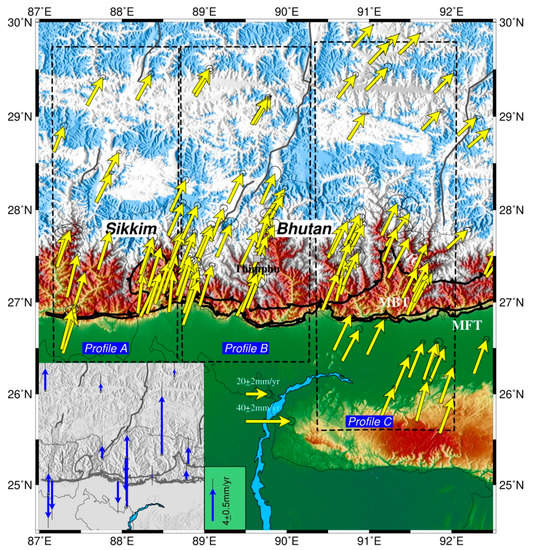 The horizontal and vertical GPS velocities in the Sikkim–Bhutan Himalaya relative to the Eurasia reference frame. The yellow arrows represent interseismic horizontal velocities. Three black dashed rectangles outline the location of velocity profiles that are shown in Figure 6. The blue arrows in the lower left inset indicate the vertical displacements of continuous sites after correcting the hydrological loading effects.