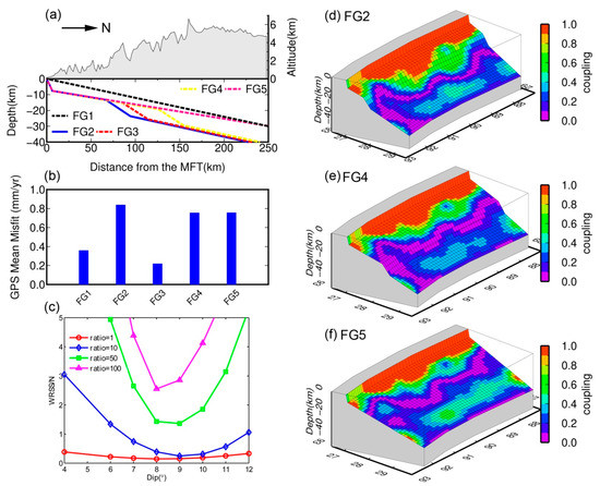 The adopted geometry of the MHT is necessarily a simplification of the complex fault systems in the Sikkim–Bhutan Himalaya based on previous studies. The uncertainty of a prior geometrical model of the MHT may affect the results of the fault coupling. To an extent, any variation in the fault geometry that can significantly disturb our coupling estimation is our concern, for which we test a series of geometrical models of the MHT, including the planar flat model (FG1), the double-ramp model with varying widths of upper-crust flat (FG2–FG4) and the single-ramp model (FG5) (Figure 11a). We assume that all the interface configurations intersect the surface along the MFT. All available GPS observations are included to constrain the coupling pattern on the assumed fault interface. The model misfits are shown in Figure 11b, and the inverted coupling distribution based on fault models FG2, FG4 and FG5 are shown in Figure 11d~f, respectively.