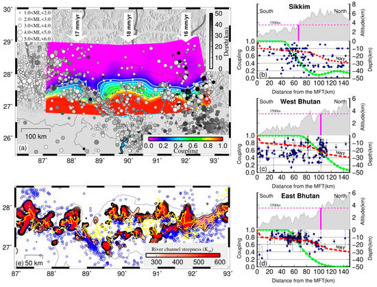 The spatial variation of coupling distribution is an essential factor that needs to be considered when we interpret relationships with the seismic activity. Here we compile all available earthquake catalogs in the Sikkim–Bhutan Himalaya to analyze the spatial relationships between the geometry of the MHT, the interseismic coupling, and the seismicity (Figure 12). The record of earthquakes used in the analysis consists of three parts: (1) Seismicity from the International Seismological Centre–Global Earthquake Model (ISC-GEM) Catalog (1900-1973) [68]; (2) The National Earthquake Information Center (NEIC) bulletin (1973–2015); (3) Earthquake catalog with time span of 2012–2014 supplemented by the Geodynamics ANd Seismic Structure of the Eastern Himalaya Region (GANSSER) network [33]. In the Sikkim Himalaya (Figure 12b), the belt of seismicity is mainly contained in the interseismic decoupling zone, although these events are not mainly focused on the interface of the MHT. Focal mechanisms of moderate-sized earthquakes in the Sikkim region suggest that the Sikkim Himalaya is characterized by a strike-slip motion on a transverse tectonic, which is different from the typical thrust tectonics in the Himalayan subduction zone [69]. This perhaps can partially explain the diffused seismicity in depth in the Sikkim Himalaya. In the Bhutan Himalaya (Figure 12a), the narrow band of seismicity appears to disappear. The seismicity in Bhutan is broadly distributed, implying that the interseismic strain accumulation beneath Bhutan could be broadly distributed rather than only in the front of the Higher Himalaya. This is supported by the normalized river-channel steepness (Ksn) in the Himalaya that is interpreted to be indicators of the rock uplift rate over a time scale of 104–105 years [70] (Figure 12e). The high-Ksn rivers in Bhutan are clustered into two bands, significantly different from the single cluster of high-Ksn rivers in Nepal that is located north of the band of seismicity.