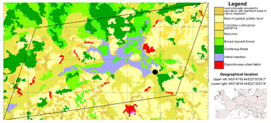 The study area in the Biebrza basin comprised over 35,000 hectares, indicated in the map of Figure 3. The map also shows the land cover classes in the study area according to the CORINE land cover map [24]. The simulations in this area were contrasted against in situ measurement conducted at a flux tower located in Rogozynek (5342’8.19”, 2324’46.9”).