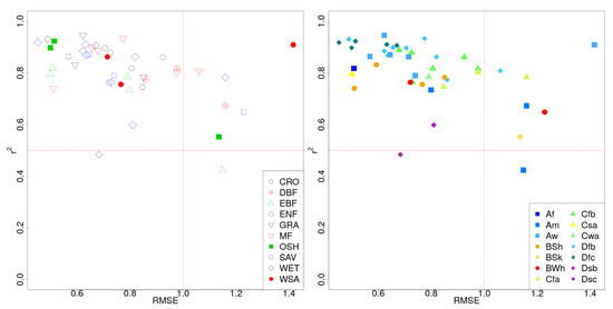 The plots of Figure 4 depict the results of the simulations in terms of the obtained and RMSE per site in association with the corresponding plant functional type and climatic zone. These plots show that all plant functional types were represented in the > 0.5 and RMSE < 1 graph quadrant. Most of the simulations falling outside that area exhibited RMSE values higher than one and belonged to climatic zones associated with tropical regions or dry climate.
