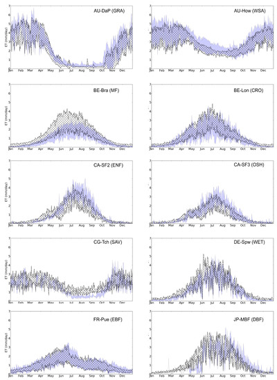 Variability of daily ET as measured at the flux towers (light blue area) and simulated (shaded area). Variability was computed as the average ± the standard deviation.