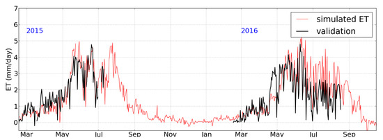 The simulations conducted for the years 2015–2016 at the location of the flux tower in Rogozynek, in the upper part of the Biebrza basin, exhibited a positive bias of 0.1685 mm/day with a root mean squared error equal to 0.6930 mm/day (n = 311). The coefficient of determination () was equal to 0.8705, and the value of the Nash–Sutcliffe Efficiency index was 0.6598. The time series of simulated and validation daily ET are presented in Figure 6.