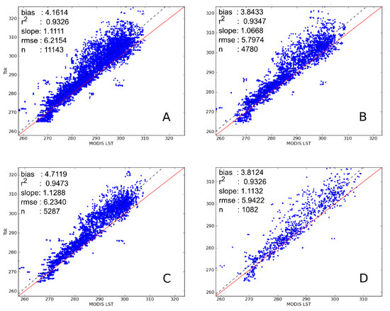 Scatterplots of MODIS LST and the skin temperature () internally estimated by the model. (A) Crops; (B) pastures; (C) wetlands; (D) complex cultivation patterns.