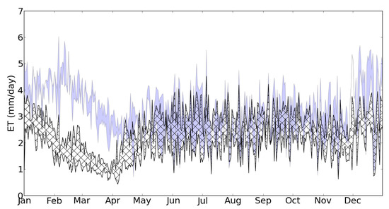 Variability of daily ET as measured at the flux towers (light blue area) and simulated (shaded area) at Sardinilla plantation, Panama (PA-Spn).