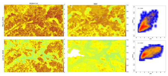 PROBA-V LAI (300 m resolution), OLCI Global VI (OGVI) and a scatterplot of both variables over the upper Biebrza basin, Poland, on 2 May 2016 and 11 July 2016.