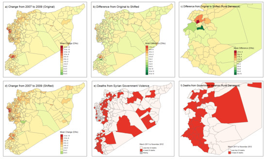 For the remainder of our study, we outline how signal shift can be identified across two different annual DMSP-OLS maps, how to resolve this issue and how this problem can affect findings. In re-examining DMSP-OLS maps of Syria from 2007 and 2009, we find a digital number position shift of approximately 17 km to the south and 4.5 km to the east. Accounting for this shift improves the analysis of De Juan and Bank [31] by correcting for the systematic underestimation of light emissions in districts with higher populations.
