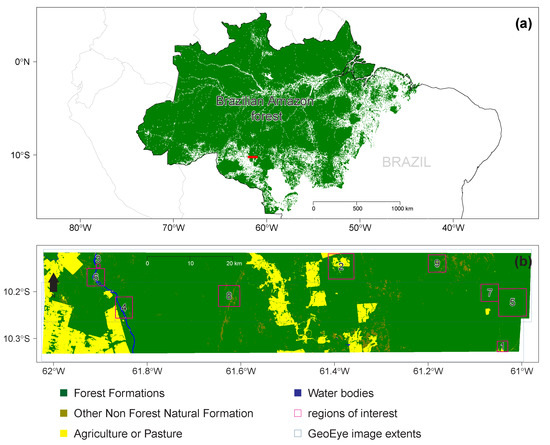 (a) Remaining Brazilian Amazon forest cover in green [8] and geographical locations of the study area in red; (b) region of interest with 2017 land use/cover classes from the MapBiomas project [42] and extents of the GeoEye-1 images used in this study.