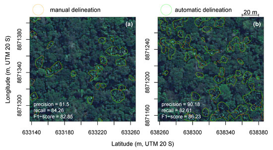 For the canopy palms segmentation, the overall accuracy was 95.5% and the F1-score was 0.70 (precision = 0.68 and recall = 0.70). An example of canopy palm segmentation with F1-score and manual segmentation is presented in Figure 4. The low F1-score can result from inaccurate manual delineation, small size of the object and palm crowns missed during the production of the training sample. The palm crowns are small in pixels number, as their diameter is between ∼10 and 20 m, and their manually delineated border is an approximation of the convex envelope of the crown and not of each individual palm leave, Figure 4. While there is sometimes a large variation between the borders from the manual and the automatic delineation, they delineate the same objects, Figure 4. This is reflected by the intersection between automatic and manual segments, that is, in the validation dataset, 82% of the manual segment intersects with the automatic segment. There were 1233 objects in the validation dataset and the model segmented 1195 objects.