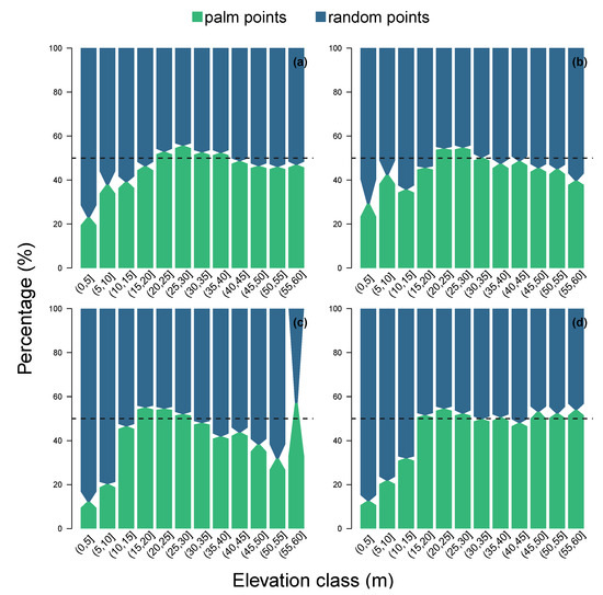 The particular canopy palm distribution near wetland and large rivers is also visible in the elevation data for the two regions presented previously (region 4 and 5 in Figure 8a,c) and for two other regions, also on the side of the river Ji-Paraná (region 6 in Figure 8b) and in wetlands near the river ’Igarapé Curral da Vara’ (region 7 in Figure 8d). Note that ALOS elevation data are influenced by the signal of the forest cover, so elevation here should be considered more as surface elevation model than a terrain elevation model. Near the Ji-Paraná river (Figure 8b), there are significantly less palms at lower elevation in comparison to a random distribution (the interval of confidence does not include the value 50%), thus more palms were found than expected by chance in the elevation between 20 and 40–45 m, and less palms than expected by chance at higher elevation. The same general pattern is observed in the wetland around the river ’Igarapé Curral da Vara’. First, the lower density when compared to a random distribution on elevation below 15–20 m and then higher density than expected by chance between 15–20 and 30–40 m and the higher elevation less or non-significantly different from a random distribution. The general pattern is consistent, and has been tested with the exact locations of a total of 69,381 canopy palms patches.