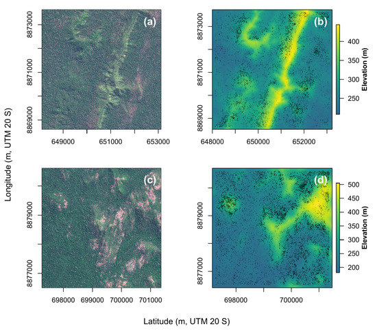 RGB image and natural distribution of canopy palms for two areas, near the river Ji-Paraná (a,b) and near the wetlands of the ’Igarapé Castanhal’ and ’Igarapé Curral da Vara’ rivers confluence (c,d).