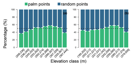 Comparison of the observed palm patches elevation and the elevation of same number of points sampled from a random distribution for the region 8 (a) = 16,129; and region 9 (b) = 15,500. For a given elevation class, if the confidence interval intersects with 50%, there is no significant difference between the distribution of palm and a random distribution for this class.