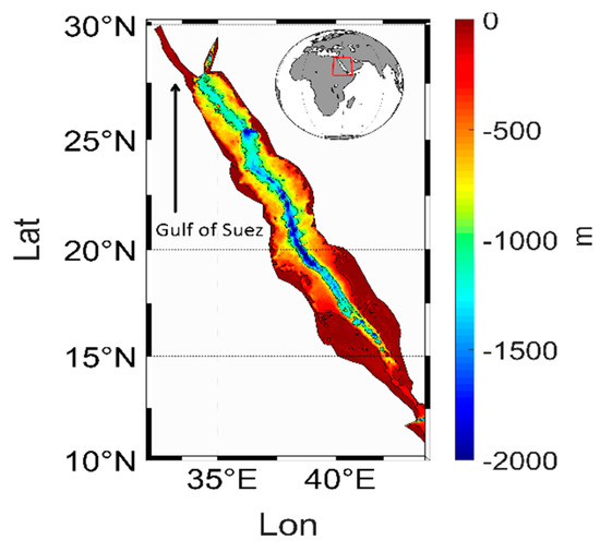 Map of the Red Sea basin associated with bathymetry in meters (m).