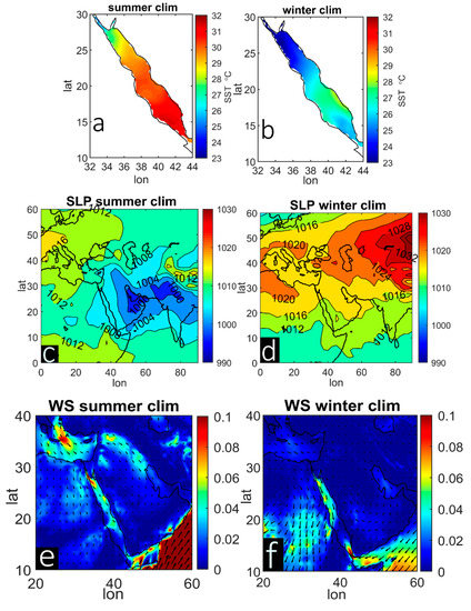 To obtain background information about the atmospheric circulation that influences the extreme SST in the RS, we also present the climatology shown in the mean sea level pressure (SLP) and wind stress maps. In summer, the entire basin is affected by the westward extension of a monsoon low that crosses the RS and combines with the Sudan thermal low (or equatorial African low-pressure system in some studies), which is a favorable condition for the development of a clear pressure gradient in southern Europe (Figure 2c). During winter, the Sudan thermal low seems to be associated with the Red Rea Trough, which may play a key role in the projection of both central Asia and Azores high-pressure systems (Figure 2d). As a result of the pressure gradients, a wide blowing of northerly wind stress over the entire RS and surrounding area was observed during the summer season (Figure 2e). The same features were observed during the winter season (Figure 2f), which is associated with the blowing of southerly wind stress that converges in the central basin.