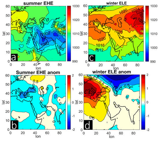 Composite SLP (a) and associated anomaly values (b) in hPa for EHEs. Same for (c) and (d), but for ELEs.