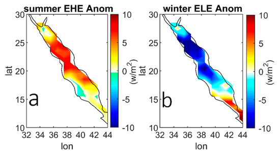 Similarly, for the ELEs during the winter period (Figure 5d), the northerly wind stress strengthens over the northern half of the basin due to the strong pressure gradient shown in Figure 4c,d. At the same time, the stronger than usual wind stress coincides with the presence of less than usual southerly wind stress over the southern end, especially in Bab-Al-Mandab, where both winds converge in the central basin. This process may explain the occurrence of ELEs in the northern half of the basin. Moreover, the western land that surrounds the RS has experienced more wind stress than the eastern side, in particular Egypt and Sudan. This may be due to the eastern extension of the Azores high that makes the SLP center tilt to the west with reference to the RS. Previous studies have investigated the role of the atmospheric circulation in the RS circulation, and all have identified the immediate importance of the wind stress contribution on different spatial and temporal scales [30,31,45,46,47].