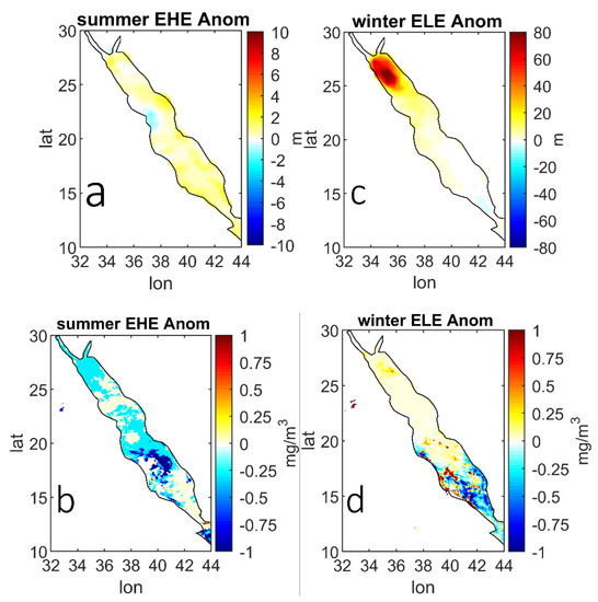 Visually, the map of MLD anomalies looks somewhat similar to the spatial distribution of the SST during ELEs, since the area of the above average MLD corresponds to the area of the spatial distribution of the SST in the far northern end of the basin (compare Figure 7c and Figure 3c). The above average MLD is a natural impact of the unstable water column caused by the theoretical existence of dense water in the surface through the contribution of a less than average SST. A further natural impact is due to the occurrence of an above average Chl-a concentration over the same area as the water column mixing process increases. Triantafyllou et al. (2014) [54] and Sofianos and Johns (2003) [33] confirmed that vertical nutrient transport in this area is controlled by a deep convection or upwelling process. Conversely, the Chl-a concentration decreases over the southern entrance of the basin during ELEs (Figure 7d). This may be due to the wind stress weakening in the area, since Chl-a is advected by the southerly wind [18,55].