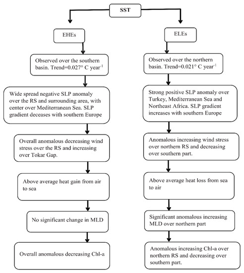 In brief, EHEs occur over the southern and northern ends, while ELEs over the northern ends only. Moreover, the positive trend in the SST indicates that warmer ocean climate conditions over the RS could be expected in the near future, increasing (decreasing) the EHEs (ELEs).