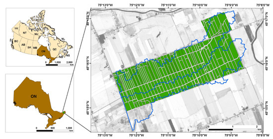 The study was conducted on a tile-drained experimental watershed in eastern Ontario, Canada (45.26 N, 75.18 W; Figure 1). Corn (Zea mays L.) and soybean (Glycine max L.) are the two dominant crops in this region of Canada and in 2016, Ontario accounted for ~60% of national grain corn acreage and ~50% of national soybean acreage [20,21]. Corn and soybean are the two primary livestock and cash crops grown in the experimental watersheds. These crops are typically planted in May and harvested in September to October. In the study area, both crops were planted at the same time every year. Crop row spacing was around 50 cm for soybean and 60 cm for corn. Soybean and corn plant densities were generally 354,000 and 64,200 plants/ha, respectively. Fall moldboard plowing and spring cultivation using chisel-style implements were the main tillage practices employed on the site. Fertilizer generally consisted of the broadcast application of granular urea prior to planting and a granular starter application. Fertilizer rates were generally ~170 kg N/ha for corn and ~3 kg N/ha for soybean, depending on soil and crop requirements. More details about the study area and agriculture practices—including tiling systems—are described by Sunohara et al. [22].