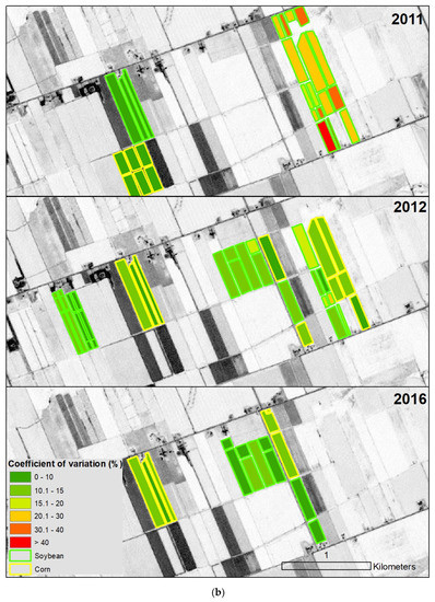 (a) Overview of corn and soybean yield variability across fields in 2011, 2012 and 2016. (b) Overview of corn and soybean yield variability across fields in 2011, 2012 and 2016. Color classes refer to the coefficient of variation (CV) of the observed yield within each field.