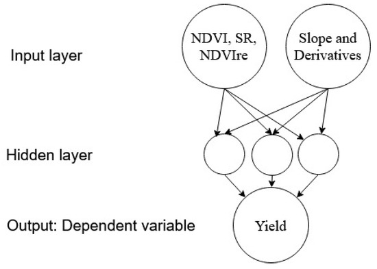 The input layer receives the controlling parameters and the neurons of the hidden layer(s) and the output layer processes the weighted signals from the neurons of its previous layer and calculates an output value applying an activation function. The default parameters were: network topology (fully connected input layer and one hidden layer with three hidden neurons), activation function (for hidden and output layers: sigmoid with a steepness of 0.5), learning algorithm (derivative of back propagation algorithm), weight initialization (“initialize” algorithm of Widrow and Nguyen) and predefined stop parameters (number of epochs = 100 and mean square error − MSE border = 0.001). The input data consisted of different spatial layers of vegetation indices (SR, NDVI, NDVIre), Lidar derivatives (slope, aspect, flow accumulation), and crop type (corn, soybean). All the data were normalized to a scale of 0 to 1 (linear scaling) for use in the ANN model. The results were scaled back to the original data scales for error analysis.