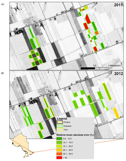 The error analysis showed low performance of the ANN models that were trained on both crop types combined (Models PM001 and PM015 in Table 5). Most of the test fields had errors above 20% for soybean and above 10% for corn (Figure 6). Models that were trained and tested in 2011 or 2012 were also used with predictor variables from 2011, 2012 or 2016. The prediction accuracy of these models was low, with RMAEs above 40% for most of the fields in all models (Figure 6; Appendix A: Table A1). The overall weaker performance of the ANN models that were trained and tested in one year, and then applied on other years could be attributed to: