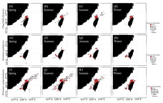 - Luan, J.; Zhang, C.; Xu, B.; Xue, Y.; Ren, Y. Modelling the spatial distribution of three Portunidae crabs in Haizhou Bay, China. PLoS ONE 2018, 13, e0207457. [Google Scholar] [CrossRef]