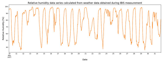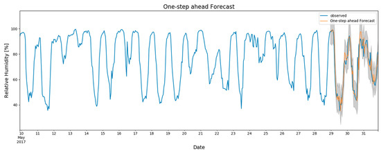 - Relative humidity data are a SARIMAX (p = 1, d = 0, q = 1) × (P = 0, D = 1, Q = 1, m = 24) with an AIC of 2997.11 (maximum AIC of 6097.14)