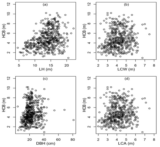 - Ritchie, M.W.; Hann, D.W. Equations for Predicting Height to Crown Base for Fourteen Tree Species in Southwest Oregon; Research Paper; Oregon State University, Forestry Research Laboratory: Corvallis, OR, USA, 1987. [Google Scholar]