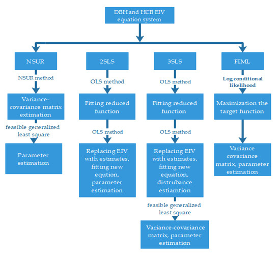 - Fu, L.; Lei, Y.; Wang, G.; Bi, H.; Tang, S.; Song, X. Comparison of seemingly unrelated regressions with multivariate errors-in-variables models for developing a system of nonlinear additive biomass equations. Trees 2016, 30, 839–857. [Google Scholar] [CrossRef]