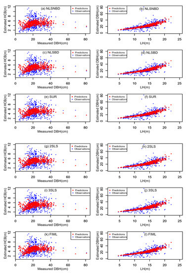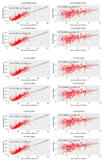 | Simultaneous equation system (Equation (3)) | NSUR | DBH | −60.0883 | 21.5831 | 0.0458 | 6.1366 |