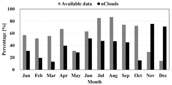 The monthly percentages of available reflectivity data (light bar) and cloud occurrences (dark bar) averaged from June 2014 to May 2016.