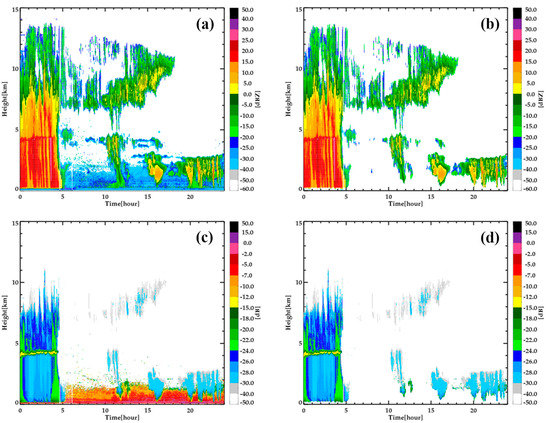 Figure 3 shows the time–height profiles of observed Z and LDR before (left panel) and after (right panel) applying quality control on 17 June 2014. Deep precipitation echoes (over 13 km) were observed from 0000 to 0500 UTC, followed by cloud echoes above 6 km and around 4 km and non-meteorological echoes below 3 km. A bright band appeared at 4–5 km with an LDR > −15 dBZ. The non-meteorological echoes below 3 km showed a larger LDR. Non-meteorological echoes were well removed by applying the quality control procedure (Figure 3b,d). However, some thin clouds and the edges of clouds were also eliminated by the continuity check. We applied this quality control to the reflectivity data of the entire case (from June 2014 to May 2016), and the quality controlled data were used for the further analysis of cloud properties.