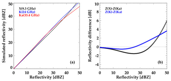 (a) Simulated reflectivities and (b) their differences in the three wavelengths, Ka (cloud radar), K (MRR), and X-band (VertiX) by assuming the Marshall–Palmer DSDs [35]. The x-axis is the reflectivity values from Equation (1), and the y-axis is derived from the scattering simulation with the condition shown in Table 3.