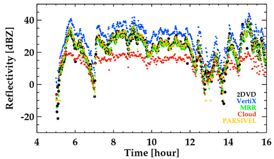 Time series of radar reflectivity from five instruments (black: 2DVD; yellow: PARSIVEL; blue: VertiX at 472 m height; green: MRR at 400 m height; red: cloud radar at 400 m height) from 0400 to 1600 UTC, 2 July 2014 (case 4 in Table 2).